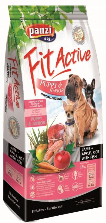 Hipoalergiczna karma dla szczeniąt i młodych psów, szczennych suk i w okresie karmienia. Pełnowartościowy, wysokiej jakości i dobrze zrównoważony suchy pokarm dla szczeniąt i młodych psów. Szczególnie polecany dla szczeniąt wrażliwych, cierpiących na alergiczne reakcje układu pokarmowego na inne rodzaje żywności. FitActive Hupoallergenic Puppy&Junior, dostarcza wszystkich niezbędnych witamin i minerałów, aby zapewnić młodemu psu zdrowy i aktywny tryb życia i zrównoważony rozwój. Kluczowym składnikiem jest jest jedno z najbogatszych źródeł łatwo strawnego białka czyli jagnięcina. Zapewnia ona wysoki poziom witamin i minerałów, takich jak B12, cynk, żelazo i selen. Witamina B12 wspomaga podstawowe i metaboliczne procesy w organizmie bardzo istotne w okresie wzrostu. Karma zawiera również ryby, które są nie tylko łatwe do strawienia, ale przede wszystkim bogate w niezbędne kwasy tłuszczowe omega-3 i omega-6. To dzięki nim, błyszcząca i zdrowa sierść jest nie tylko piękna, ale ma wiele ważnych funkcji, takich jak izolacja cieplna czy ochrona przed promieniowaniem słonecznym i innymi czynnikami atmosferycznymi. Optymalna podaż niezbędnych kwasów tłuszczowych Omega-3 i Omega-6 jest ważna dla uzyskania właściwego stanu zdrowia, młodego, dynamicznie rosnącego pieska. Karma doskonale sprawdzi się także u suczek, szczennych i w okresie laktacji, odpowiadając na zwiększone zapotrzebowane na łatwo przyswajalną, hipoalergiczną energię. Zalety karmy: Składniki: Mięso i pochodne zwierzęce (jagnięcina min. 26%, ryby min. 5%), kukurydza, pszenica, tłuszcz zwierzęcy, otręby, ryż, marchew, digest, drożdże, jabłko, omega-3, omega-6, glukozamina, chondroityna, ekstrakt z juki schidigera Analiza: Białko 26,00%, oleje i tłuszcze 14,00%, popiół surowy 12,00%, włókno surowe 3,50%, wilgotność: 11,40% Witaminy i minerały: lizyna 1,15%, metionina 0,41%, treonina 0,88%, tryptofan 0,33%, arginina 1,57%, izoleucyna 0,79%, leucyna 2%, walina 1%, wapń 1,98%, fosfor 1,08%, sód 0,75%, cynk 93,500 Mg / kg, miedź 16.500 mg / kg, żelazo 330.000 mg / kg, magnez 33.000 mg / kg, jod 1.100 mg / kg, selen 0.100 mg / kg, kobalt 1.100 mg / kg, witamina A 13.750 jm / kg, witamina D 3: 1325.500 mg / kg, witamina E 77.000 mg / kg, witamina K-3: 2.200 mg / kg, witamina B-1: 4.400 mg / kg, witamina B-2: 6.600 mg / kg, witamina B-5: 11.000 Mg / kg, witamina B-6: 5.500 mg / kg, witamina B 12: 0.030 mg / kg, biotyna 0.280 mg / kg, Niacyna (B3) 27.500 mg / kg, kwas foliowy 1.060 mg / kg, chlorek choliny 2556.352 mg / kg