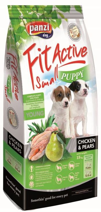 Kompletna i dobrze zrównoważona, wysokiej jakości karma dla szczeniąt małych ras, młodych, rosnących psów do 12 miesiąca życia, a także dla suk w okresie szczennym i laktacyjnym. Fit Active Puppy Small dostarcza wszystkich składników odżywczych, w tym niezbędnych witamin i minerałów, tak ważnych w okresie wzrostu i rozwoju młodego zwierzęcia. Wysoka zawartość kurczaka zaspokaja podwyższone potrzeby na białko zwierzęce, a znacząca ilość łatwo przyswajalnych ryb, dostarcza dodatkowo niezbędnych kwasów tłuszczowych, omega 3 i omega 6.  Błyszcząca i pięknie wyglądająca sierść świadczy o tym, że jest zdrowa i wywiązuje się z ważnych funkcji, takich jak izolacja cieplna, ochrona przed szkodliwym promieniowaniem słonecznym czy innymi czynnikami atmosferycznymi. Właściwy balans i wykorzystanie niezbędnych kwasów tłuszczowych Omega-3 i Omega-6 są istotne również dla prawidłowego funkcjonowania układu nerwowego oraz odpornościowego. W składzie Fit Active Puppy Small znajdziemy także gruszki. Owoce te są bogate w witaminę C i polifenole, wspomagając układ odpornościowy i obniżający poziom cholesterolu. Zawartość chondroityny i glukozaminy jest nieoceniona w prawidłowym rozwoju stawów.